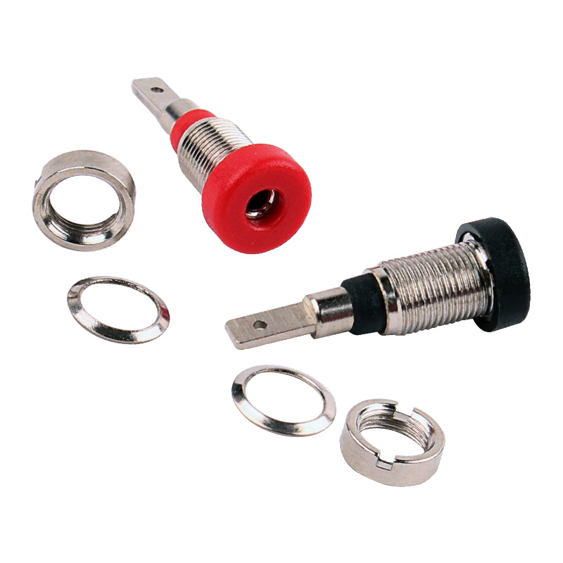 純銅鍍鎳嵌入式2mm輸入端子,采用金屬螺帽直接在面板進行固定,耐高溫尼龍塑料,尾端建議使用插片連接。